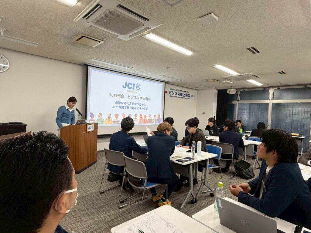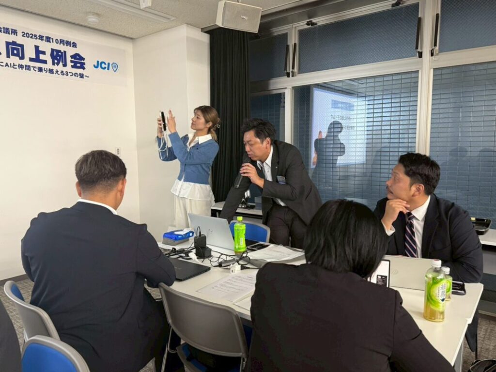 今回のビジネス向上例会では講師に、AI研修を様々な企業に実施し、生産性向上やコスト削減を実現してきた糸洌有希先生をお招きし、ケーススタディを活用したワークショップを行いました。『生成AIによる多様な視点』と『多様な職種のJCメンバーの知見』という2つの力を活用し、3つの壁(①視点の壁②思考の壁③表現の壁)を乗り越えることで例会目的である柔軟な考え方を体験しました。